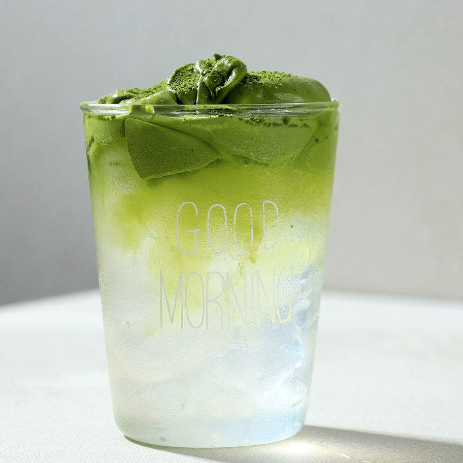 Bright, tropical pure ceremonial uji matcha poured over young coconut water and nugget ice